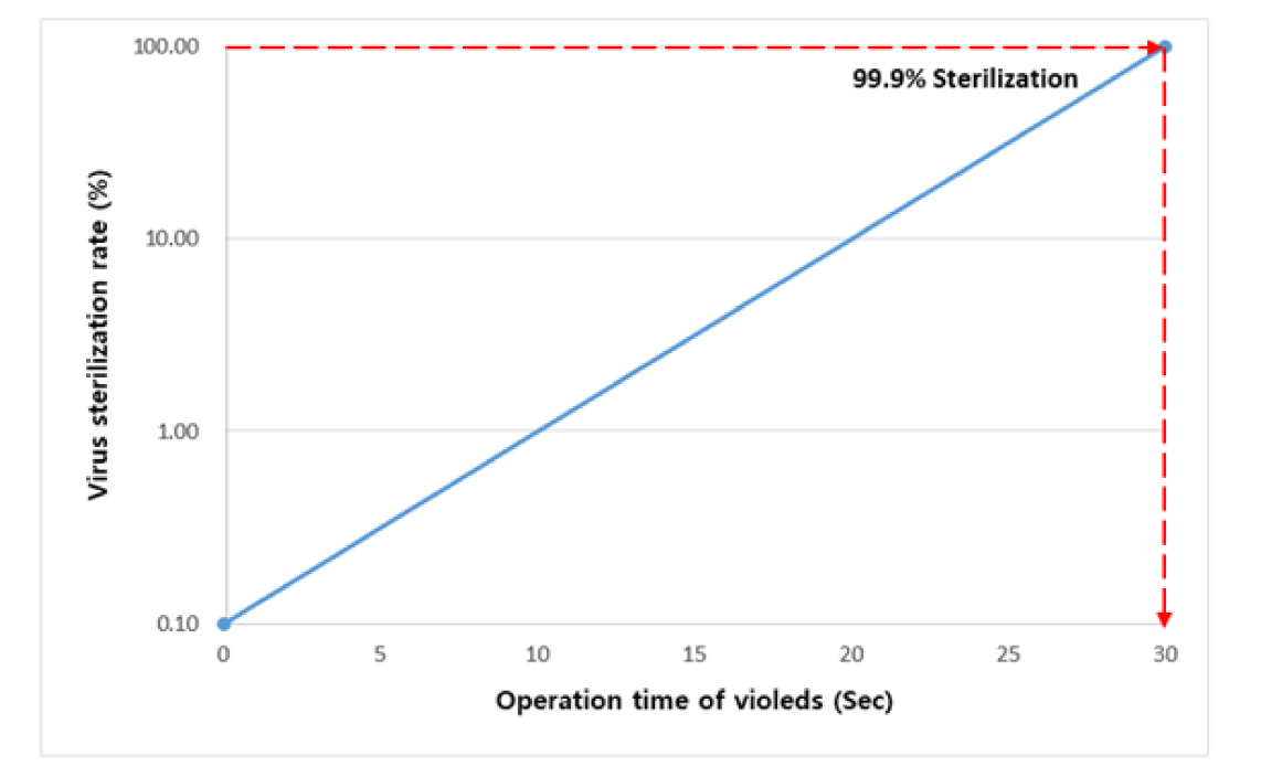 图 2. 暴露时间与病毒灭菌率(Violeds与病毒的距离:3cm)