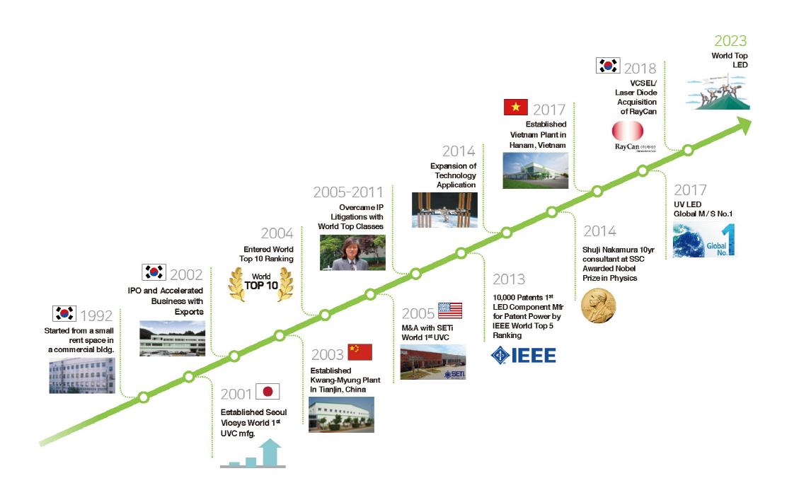 首尔伟傲世是UV LED、VCSEL(垂直腔面发射激光)、新一代3D传感器和激光光源、以及用于显示的单像素RGB“微清洁像素”的全系列解决方案提供商。公司成立于2002年,是首尔半导体公司的子公司,在UV LED行业占据了第一的市场份额(LEDinside, 2018)。首尔伟傲世拥有全面的LED产品组合,包括所有波长范围(200nm到1600nm)的紫外线(UV)、可见光和红外线。它拥有超过4000项的UV LED技术相关的专利。Violeds是其旗舰产品UV LED技术,为众多行业提供了杀菌和消毒(UVC)、皮肤治疗(UVB)、水/空气净化和园艺有效栽培的解决方案。2018年,首尔伟傲世收购了光电专家RayCan公司,添加了先进的VCSEL技术,支持智能手机面部识别和自动驾驶,并已开始量产。在2020年1月,它推出了一款颠覆性的“微清洁像素”,有可能成为显示屏市场的游戏规则改变者。更多信息,请访问http://www.seoulviosys.com/cn/。