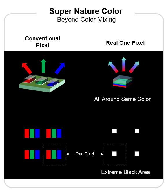 Micro-LED produced by Seoul Viosys can achieve deep black color and clear image thanks to the stacked structure. Also, as colors combining R/G/B are emitted externally from inside a pixel, viewers can enjoy clear pictures without distortions from any direction.