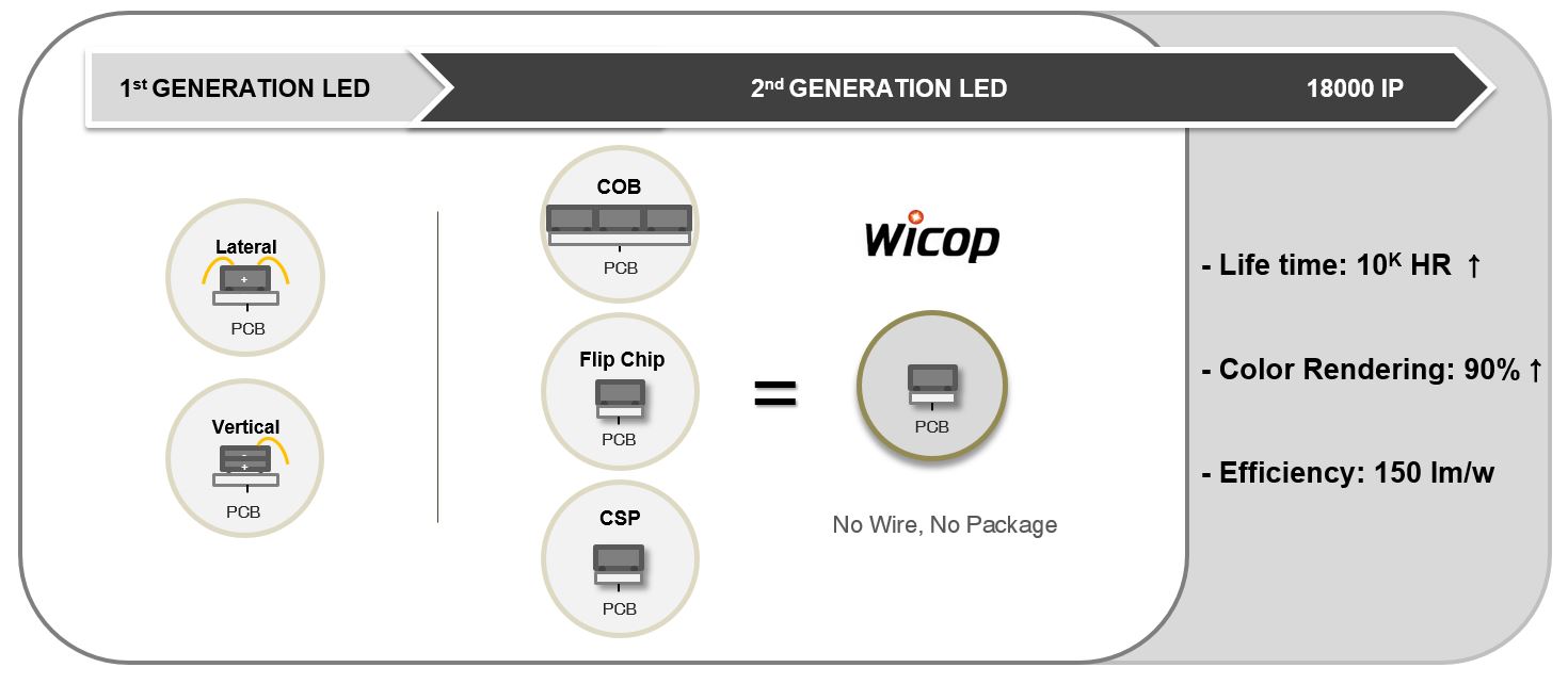 Seoul has made huge investments in the R&D of optical semiconductors for the past three decades since its establishment. With the establishment of 18,000 intellectual properties, Seoul is leading the second-generation technology in the LED industry. Particularly, WICOP is a revolutionary patented technology essential for manufacturing Mini-LED, Micro-LED, and intelligent front-lighting systems (ADB, Adaptive Driving Beam). This technology realizes the operation of high-power LEDs without wire, package,optical lenses.