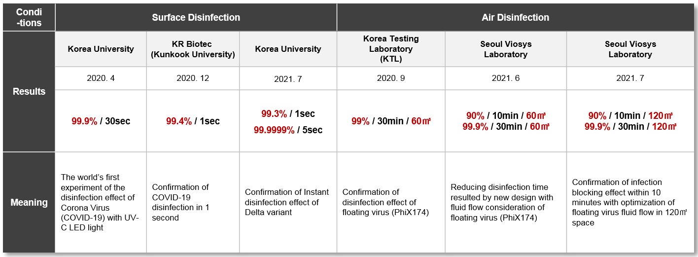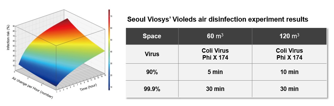 (Right) Seoul Viosys’ Violeds air disinfection experiment results