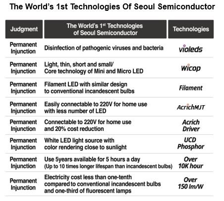 Seoul Viosys and its affiliates are leading developers of 2nd Generation Technologies. And they have successfully obtained permanent injunctions and orders of recall against products infringing their patented technologies.